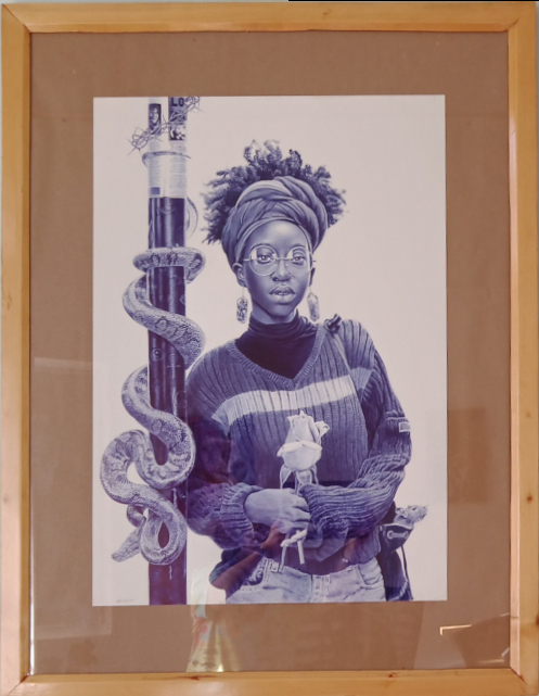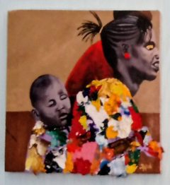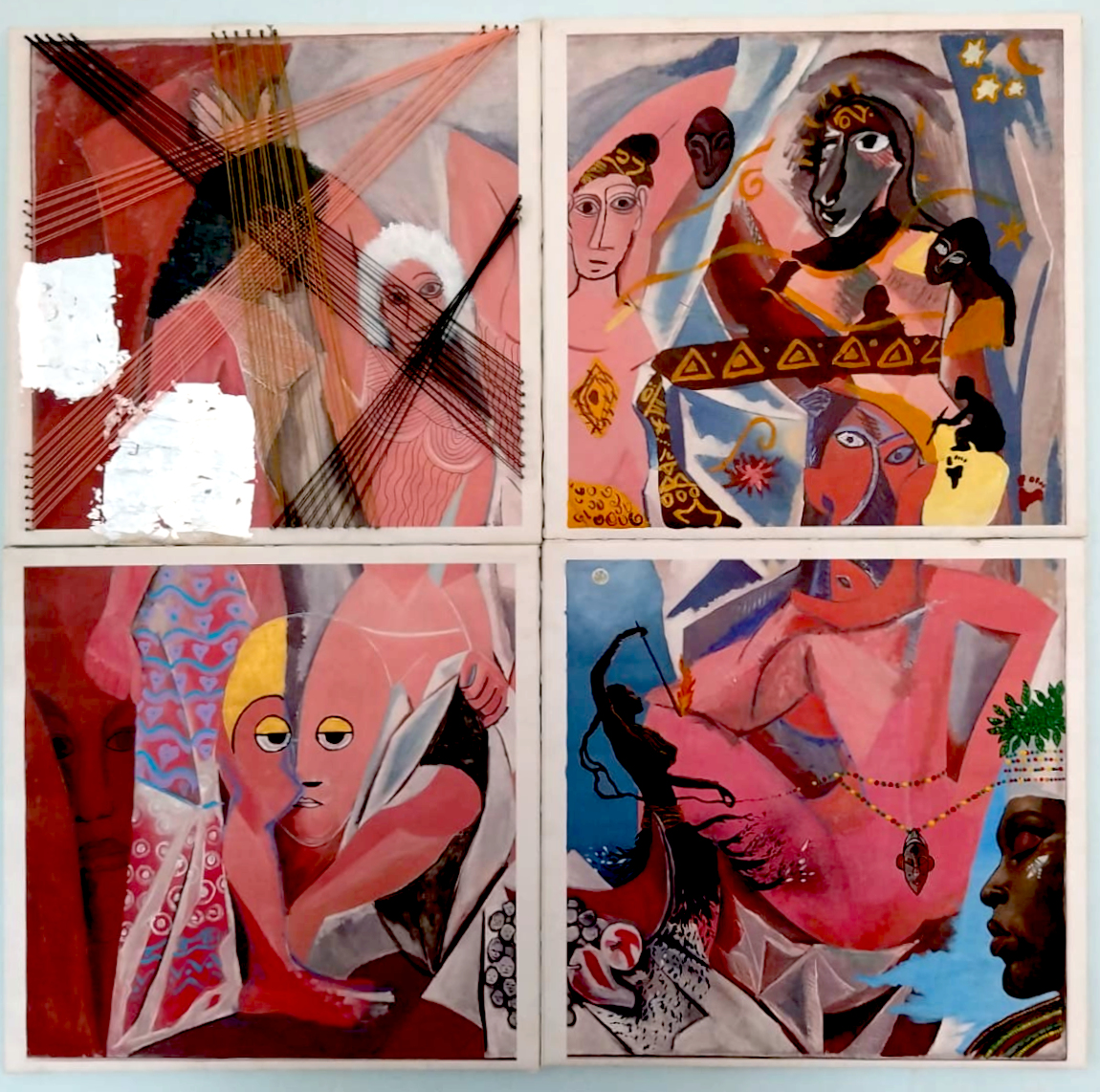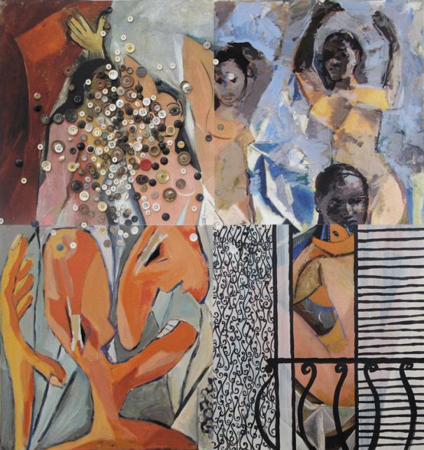 A central work in the exhibition is a reinterpretation of Les Demoiselles d’Avignon by Pablo Picasso. In the original painting, Picasso used African masks within a modernist idiom. In an initial version for the East African Biennale, Mertens, Ricardo Brey, Mulugeta Tafesse, and Willo Gonnissen made a symbolic intervention to return this appropriated visual language to Africa. In Moshi, four Tanzanian artists: Lilian Munuo, Lightness Jonas, David Valerian Mlay and Prince John Hugo realized a new version of the work, complemented by pieces from their own oeuvre.