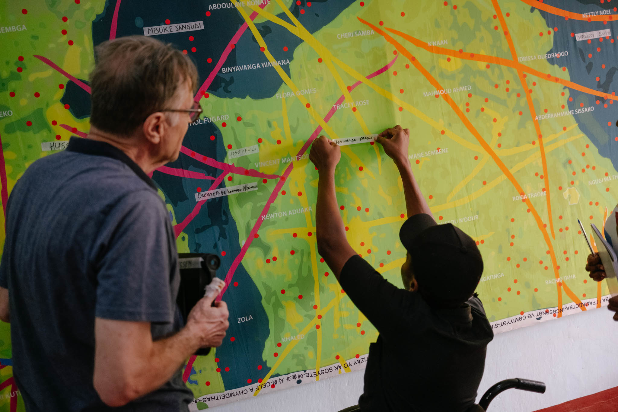 African Heroes, a work on kanga fabric, departs from the city map of Dar es Salaam. Together with fellow artist Willo Gonnissen, Mertens overlaid this map with the life lines of a hand and a star chart. The names of the stars were replaced by those of African heroes, often silenced or erased by colonial history. In Moshi, the work became interactive: visitors added the names of their own heroes in large numbers, allowing the work to evolve into a collective, living memory.