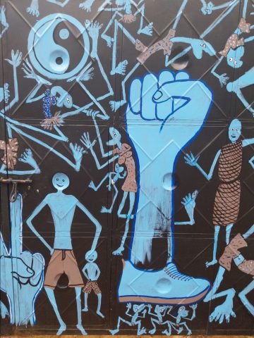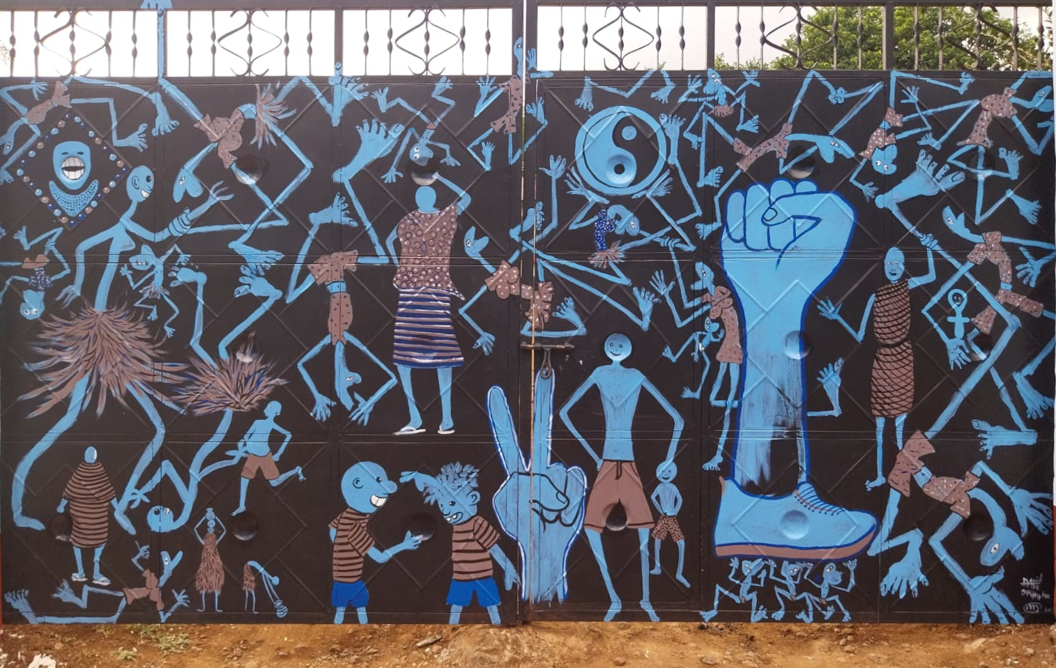 Five of the six works by Mertens originated in his participation in the East African Biennales. A collaborative mural, originally created in Dar es Salaam, was re-executed for this exhibition as a painted entrance gate to the site. Mertens realized this work together with the Tanzanian artists David Valerian Mlay and Prince John Hugo.